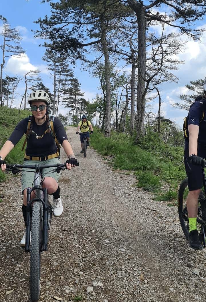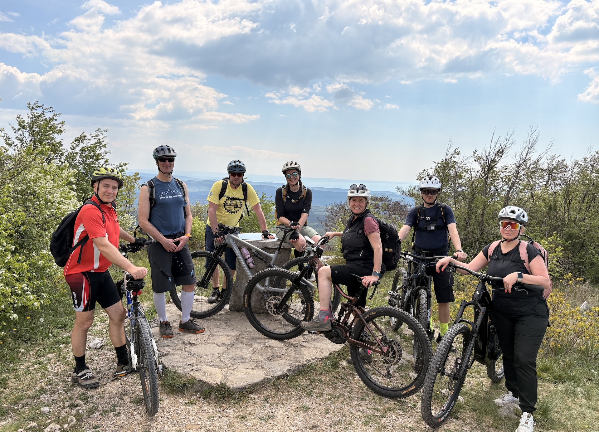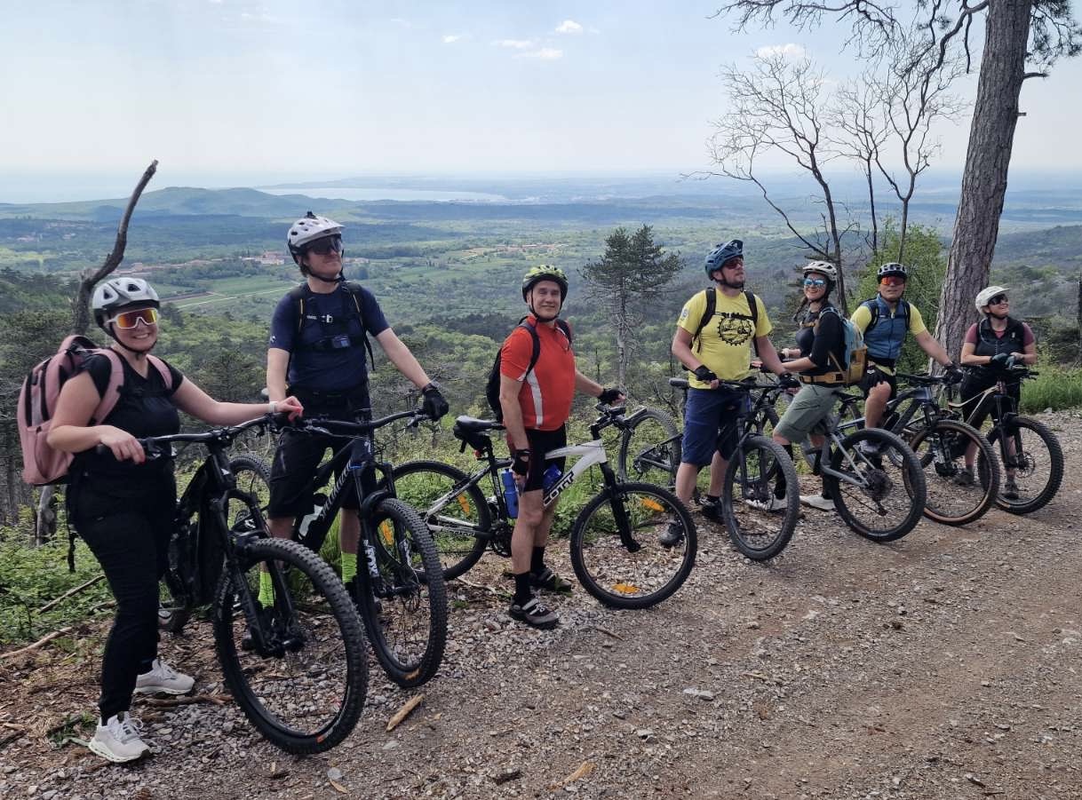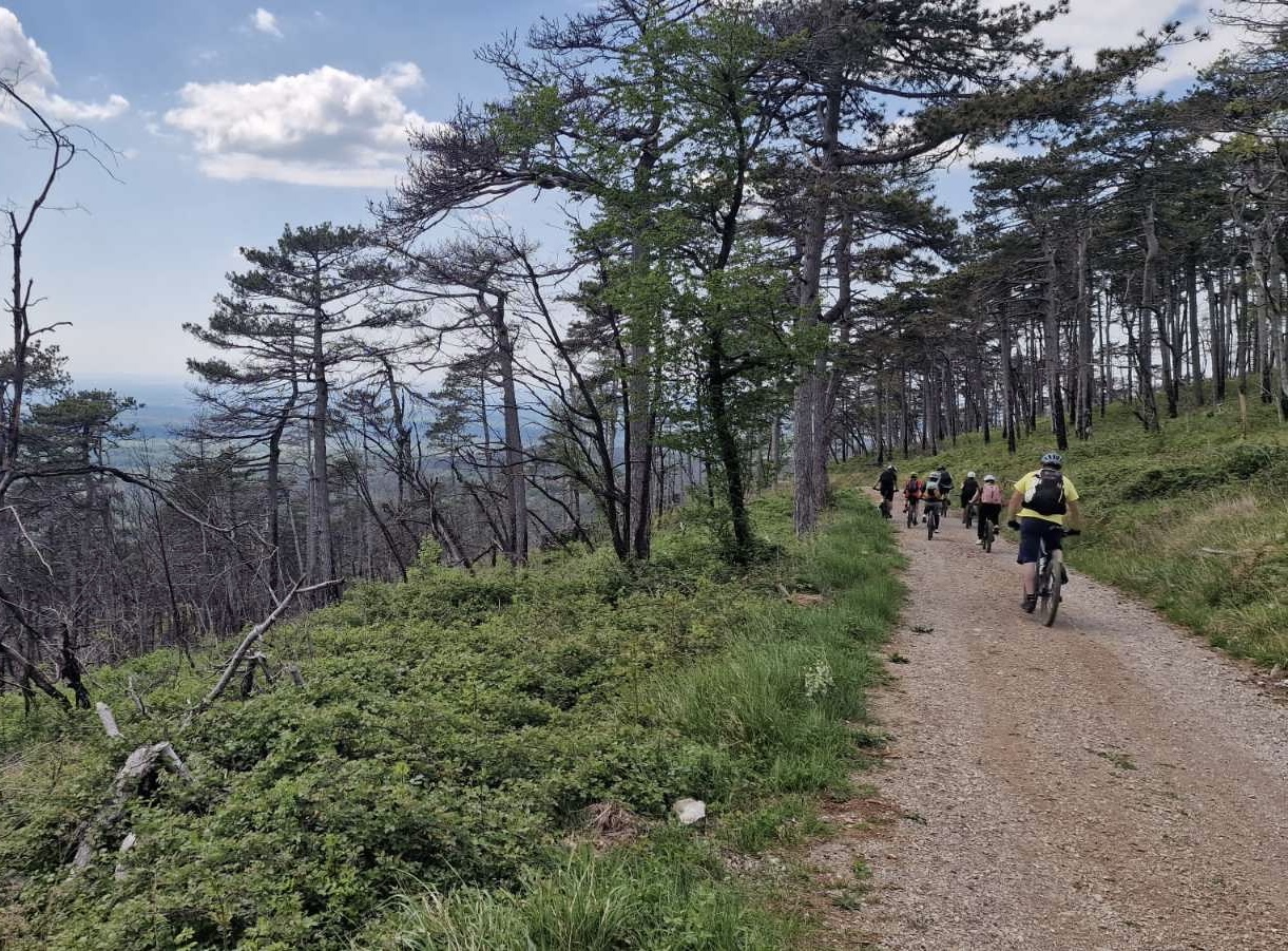 Po precej »zahtevni« kraški podlagi smo v objemu sonca, cvetočih grmov in dišavnic vihteli pedala vse do Stjenkove koče na Trstelju in naredili prvo daljšo pavzo. Za glasbeno spremljavo med malico je poskrbel kar oskrbnik sam, ki je okoli koče žvrgolel kot ptiček. Po pavzi je sledil še krajši vzpon do samega vrha Trstelj, ki je ponudil krasen razgled na Vipavsko dolino, Kras, Tržaški zaliv in Furlanijo.