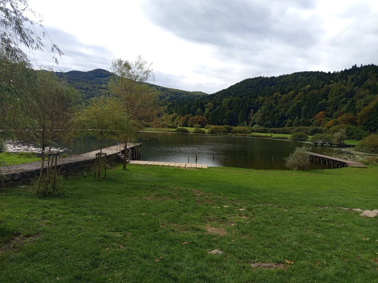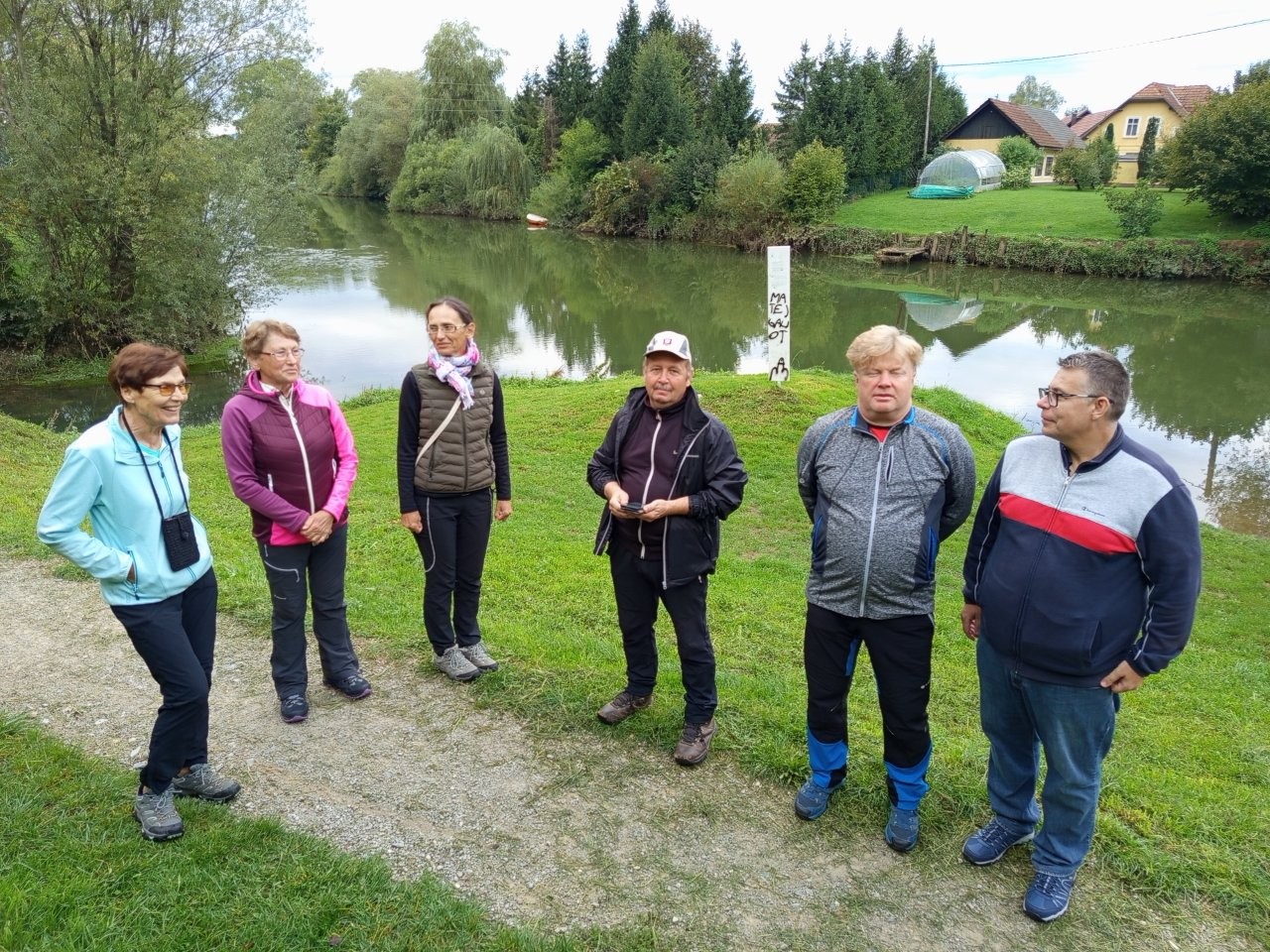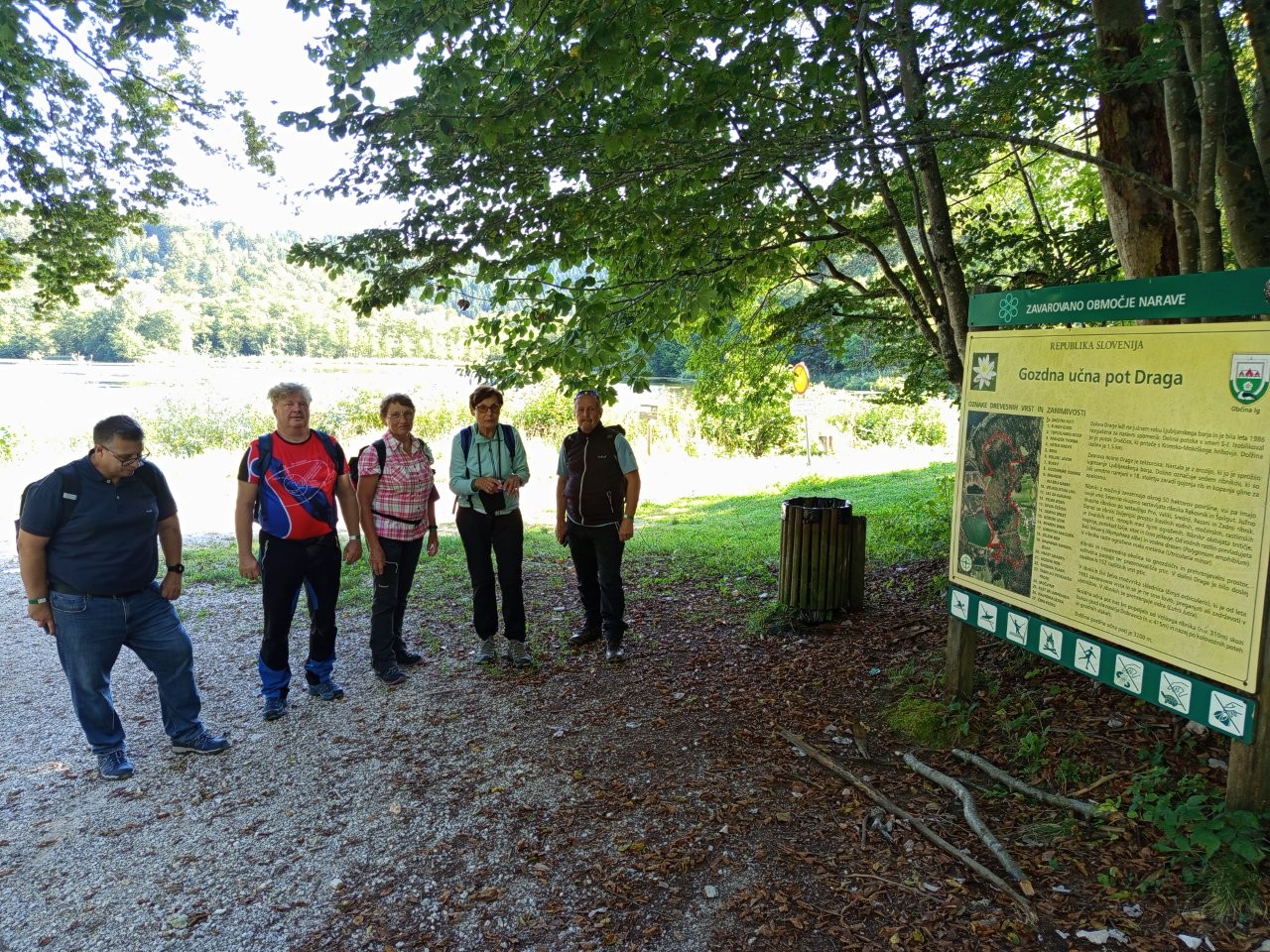 Malce pred 16. uro smo se peš odpravili proti bližnji Gozdni učni poti Draga, ki je bila današnja tretja in zadnja programska točka. 3,2 km dolga krožna pot je opremljena s 27 lesenimi tablami (večinoma z imeni drevesnih vrst), kot markacija služi beli lokvanj, in poteka po gozdnih vlakah ter delno po vaških cestah. Del je poteka ob ribnikih v dolini Drage, ki so tudi naravni spomenik. Ribnike obdaja trstičje, rogozje, šašje, črno jelševje, od vodnih rastlin prevladujeta beli okvanj in vodna dresen. Zaradi ekstenzivnega načina gospodarjenja so ribniki pomembno gnezdišče vodnih ptic, življenjski prostor vidre, močvirske sklednice, več vrst rib, dvoživk in kač, v okoliških gozdovih pa živijo vse tri vrste naših zveri (ris, volk, medved). Pot je bila prijetna, poučna, skozi vas Dobravica smo poklepetali tudi z domačini, z nekaj planinskega vzpona in spusta (kar je Vida odvrnilo od hoje in se je raje sprehajal le ob ribnikih) pa nam je po uri in pol uspelo dati piko na i slikovitemu in poučnemu vandranju po Ljubljanskemu barju, nakar smo se odpeljali domov in si okoli 19-ih pomahali v slovo.